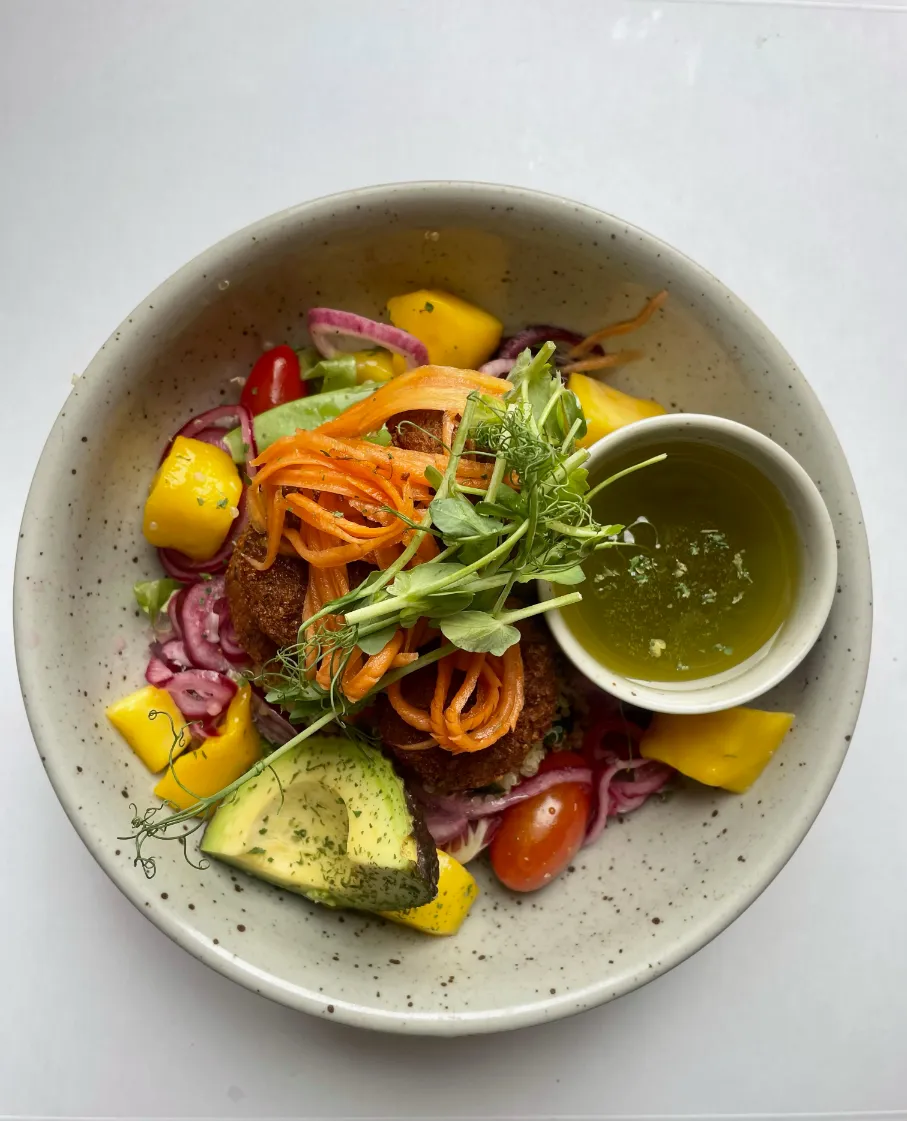 Sallad, quinoa, sugarsnaps, tomat, mango, picklad rödlök, avokado, basilikaolja.