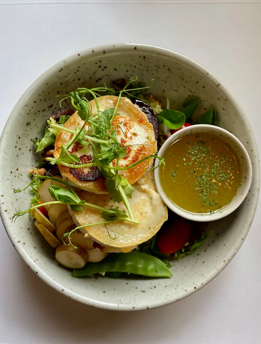 Sallad, sockerärtor, tomat, rödbetor, päron, valnötter, ljummen chevre och honungs- & citrondipp.